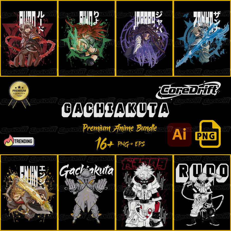 The Gachiakuta Premium Design Bundle features a set of carefully crafted anime-inspired graphics designed to elevate your clothing brand or creative project.